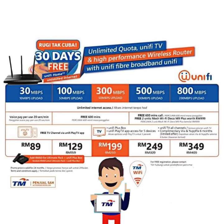 . TM Unifi package offer the speed from 30Mbps to 800Mbps with the price range RM89month to RM349month. Refer below for the package details and pricing charts. Unifi package subscription comes with free.